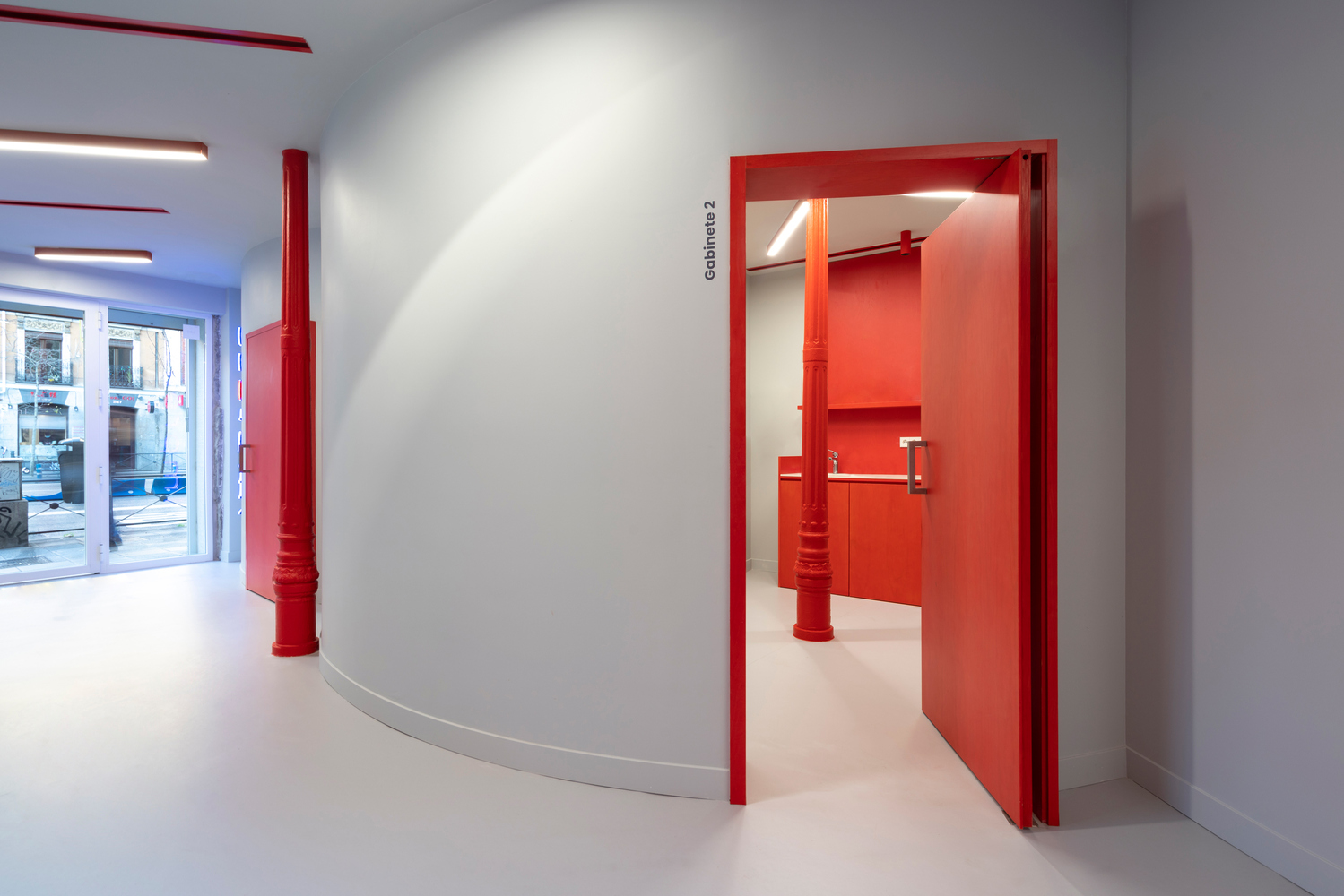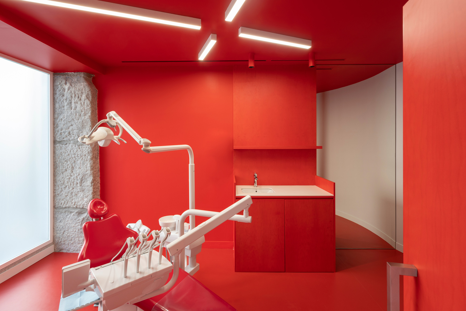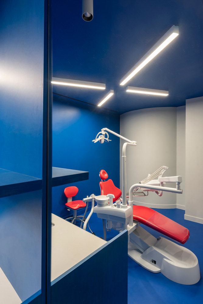 今天這個項目案例是位于西班牙馬德里的Impress牙科診所,這家診所主要針對年輕用戶,相較印象中醫院往往以白色為主色的設計風格,這個項目大膽制造了紅色與藍色的碰撞,營造出了強大的視覺沖擊。